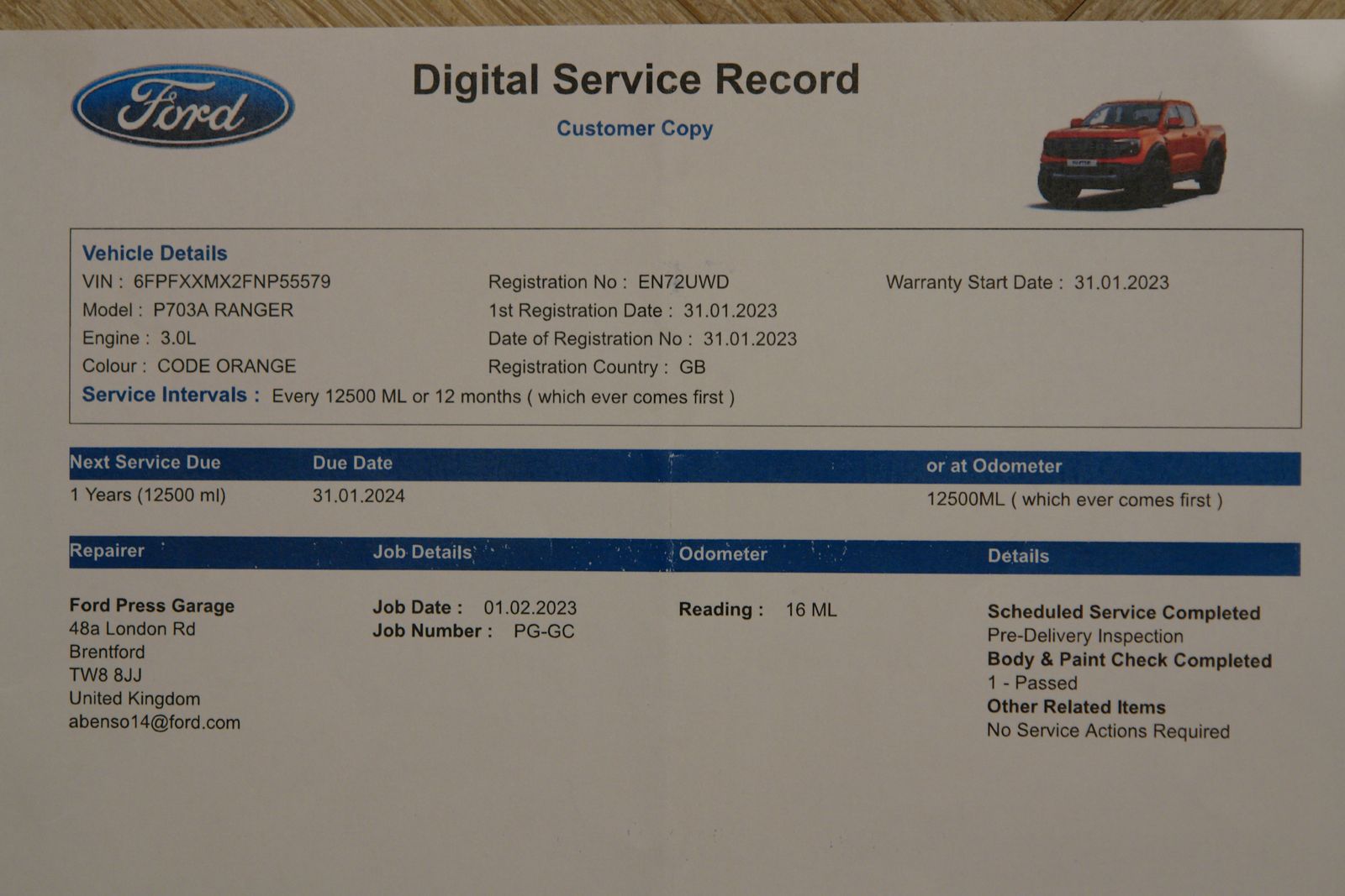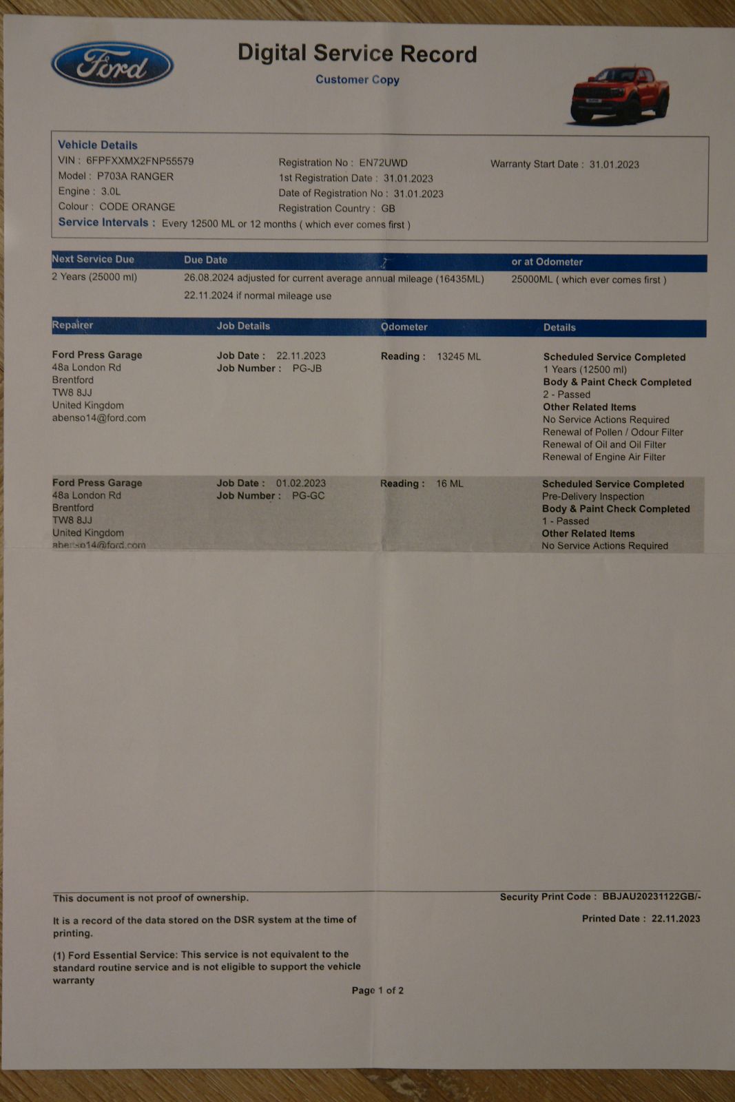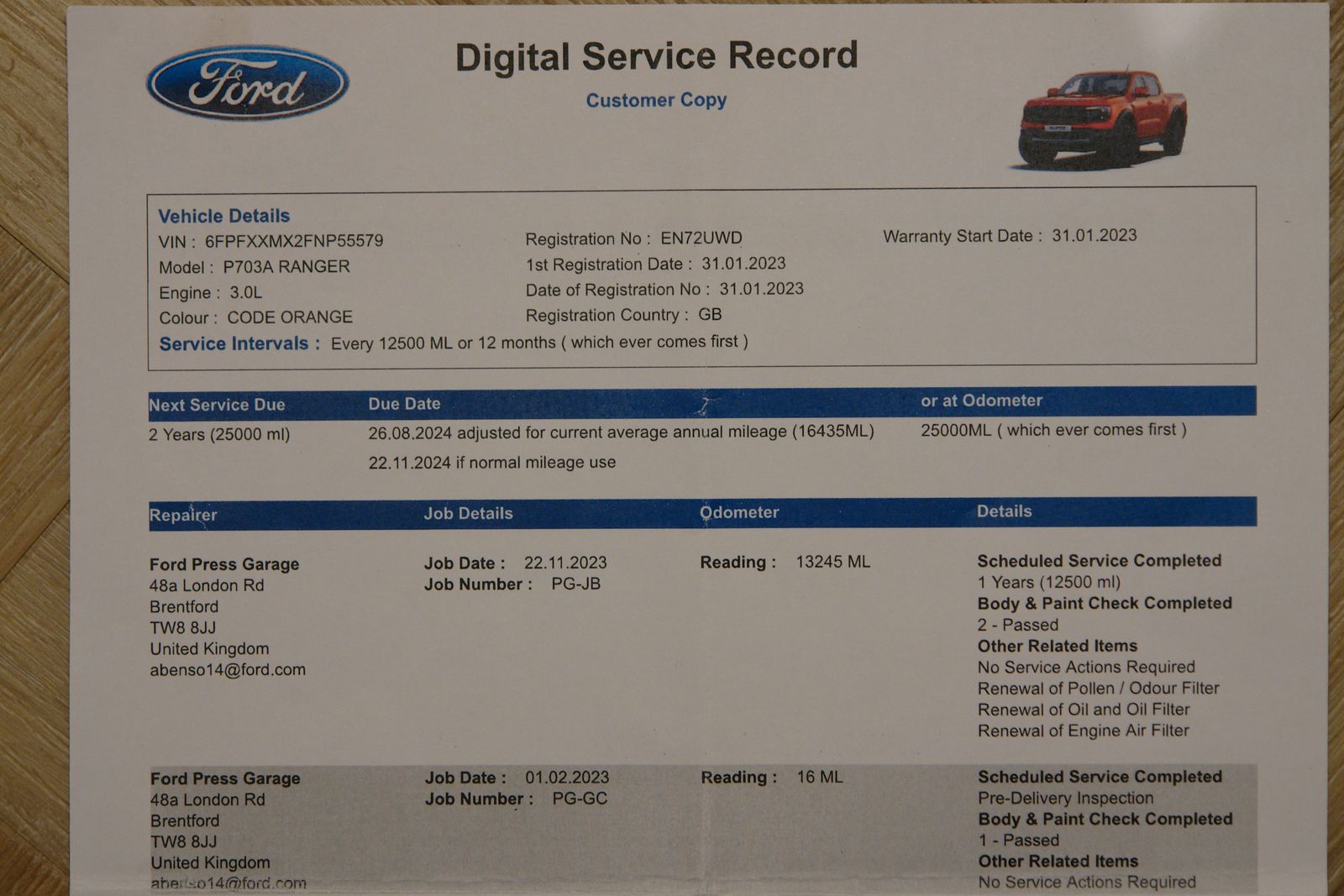 ## JUST ARRIVED!! ## A stunning looking Raptor in rare Code Orange, with towbar and electric roller shutter, it comes with full Ford service history and extended warranty to 2027. PLEASE WATCH THE VIDEO and VIEW ALL THE PHOTOS (of the car and documentation). It's been privately owned (so no VAT to pay) and comes equipped with 240V mains sockets (2), tailored plastic loadliner and carpets, heavy duty tailored rubber mats for the cab, 6 overhead auxilliary switches (could be used for lightbars or a winch?) as well the usual B&O sound system, 360 cameras, heated seats & steering wheel, lane change assist, adaptive cruise control, LED headlights, DAB, Bluetooth, various steering, suspension & exhaust modes (see photos). Powered by a 3.0 litre turbocharged petrol engine spec'd at almost 300bhp coupled to a 10 speed automatic gearbox and selectable mode 4 Wheel Drive System. This ensures smooth & safe power delivery in all weather conditions with 0-60mph in just 7.9 seconds. There is a full Ford service history (last serviced at 26,172 miles). It was purchased as a 1 owner vehicle in August 2024 with an extra £1257 spent on 3 years breakdown cover, a 12 months extended warranty (which takes over from the Ford manufacturer's warranty in February 2026) and a Diamondbrite Ceramic Coating. We're selling it as a private sale on behalf of the owner so, as the buyer, you can benefit from the the transfer of these. PLEASE WATCH THE VIDEO and VIEW ALL THE PHOTOS (of the car and documentation). We welcome part exchanges, we're licensed credit brokers and we can help with cherished transfers. We are also close to the airport and railway stations. THIS CAR CAN BE RESERVED with NO COMMITMENT TO BUY with a small payment (we'll take it off sale for you to view at your convenience). PLEASE CALL 07800 911 911 TO ARRANGE TO VIEW OR TO RESERVE THIS CAR www.autoperform.com